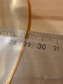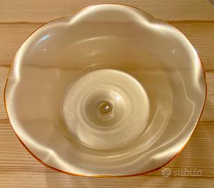 Centrotavola, alzata in vetro. Calice ampio ma sorprendentemente leggero. Luccichio dorato con bordo di un colore oro più intenso.
