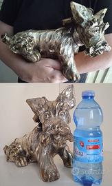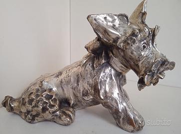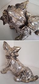Simpatica scultura vintage di cagnolino (piccolo terrier, forse yorkshire o scottish (scozzese) terrier) con fiocco in terracotta argentata.