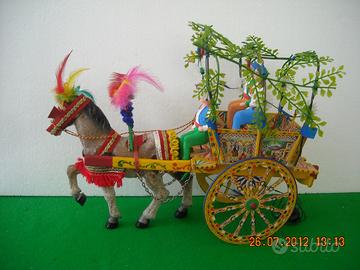 Ricco CARRETTINO SICILIANO frutto del magistrale lavoro artigianale eseguito a regola d'arte ed il risultato si vede!Questa versione del carrettino è realizzato con i tradizionali colori della SICILIA,il cavallo è addobbato con PIUME MULTICOLOR,3 PASSEGGERI che indossano il COSTUME tradizionale dell'isola e...dulcis in fundo arricchito con una verde PERGOLA intramezzata da mini LAMPADINE multicolor completano il quadretto che è senza dubbio il vero simbolo della SICILIA.Prodotto NUOVO dalla GIDI'S negli anni '90 made in SICILY nella sua misura GRANDE,l'articolo 6/L,lungo cm 42,largo cm 15 ed alto cm 30 è un fantastico trionfo di colori solari,ancor più quando è illuminato, ideale da regalare o da collocare in casa per essere ammirato.Custodito nella sua scatola cartonata originale.Non assicuro il funzionamento causa la risaputa delicatezza dei pisellini e il lungo tempo trascorso.Posso fornire quantità maggiori su richiesta.