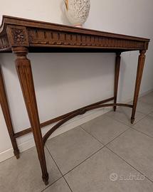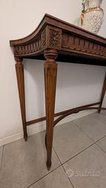 Consolle di grandi dimensioni, risalente agli anni '40 circa. È di grandi dimensioni e di grande effetto, con un design a spacco sui lati. Sono presenti rosette intagliate agli angoli e intagli scanalati lungo tutto il bordo superiore. Le gambe sono solide e robuste. Lastra di marmo bianco come appoggio. Le condizioni sono eccellenti per la sua età, con solo qualche piccola usura storica e piccoli segni qua e là. Il colore e la patina sono splendidi. Lunghezza - 128 cm Profondità - 16 pollici, 38 cm Altezza - 35 pollici, 83 cm Solo ritiro a mano, no spedizione.