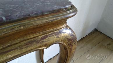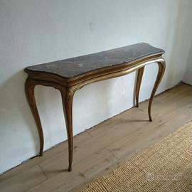 Elegante consolle a parete anni ´50 in legno di mogano massiccio dorato con ripiano in marmo rosso di Levanto, 147x40x85 cm, ripiano: 143x39x2 cm, struttura in condizioni perfette, marmo con spaccatura pressoché invisible al centro, causa trasloco.