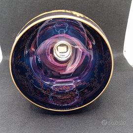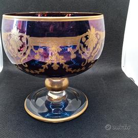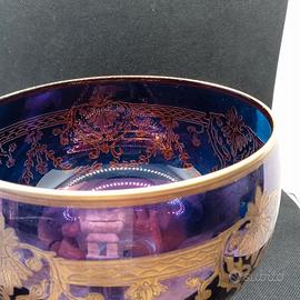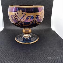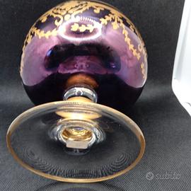Bellissima coppa in cristallo color prugna viola con disegni in oro zecchino. Da collezione. Vintage. Dimensioni altezza 14,5 cm larghezza 14 cm.