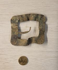 La fibbia come si vede in paragone con una moneta da 10 centesimi è molto grande, presenta dei disegni di fiori in tutta la parte frontale, il che lascia presagire che fosse ad uso civile probabilmente da parte di una donna, l'eleganza e le dimensioni suggeriscono che facesse parte di un vestito appariscente.