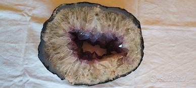 Il geode si presenta aperto su due facce, ben visibili i cristalli viola all'interno.
