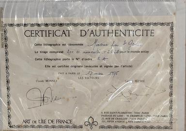 Suggestiva GRANDE Litografia originale dell'artista bretone Francis de Saint-Geniés (1925-2018) intitolata "Minerve" (eseguita nel 1975). La litografia, sul retro, presenta regolare certificato di autenticità ed inoltre una sua esaudiente biografia (entrambi i documenti in lingua francese). Sulla parte anteriore, in basso, è evidente anche il bollo di originalità a rilievo (vedi foto annuncio).