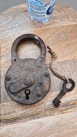 Enorme Vecchio Lucchetto Di Epoca Antica Fine 800 Inizio 900 Con Chiave 17 Cm. Pesa poco più di 1kg senza chiave. Questo è un lucchetto d'epoca a "padella" in ferro battuto , probabilmente della fine dell'800 o primissimi del '900. È un pezzo di antiquariato industriale o rurale. La cosa più preziosa è che ha ancora la sua chiave originale inserita e funzionante Analisi dell'oggetto Tipo: Lucchetto a leva rotante con copri-toppa (la linguetta che ruota per proteggere il buco della serratura dalla polvere). Stato: È ricoperto da una "patina" di ruggine antica. Non sembra una ruggine distruttiva, ma superficiale, tipica degli oggetti conservati in solai o cantine. Chiave: La chiave a "pipa" integra. il meccanismo gira