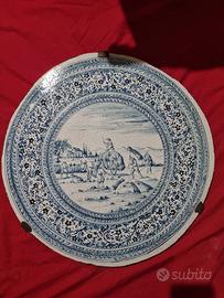 Maiolica ceramica targa da muro, raffigura il mondo rurale / contadino fine 800 inizio 900, nella raccolta fieno - sfalcio erba ( con gli attrezzi rurali d'epoca) contornato da bellissimi fiori di campo.
