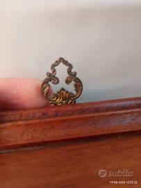 La cornice è in legno forse ciliegio, è pesante ed adornata sui 4 angoli da applicazioni ottonate, chiusa sul retro con chiodini ottonati a testa tonda, ganci per appendere lavorati e decorativi e vetro di copertura.