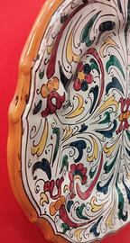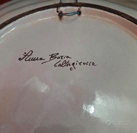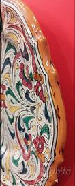 Splendido piatto decorativo in ceramica maiolicata di Caltagirone. Prodotto 100% artigianale, modellato al tornio e dipinto minuziosamente a mano, con motivi floreali e arabeschi dai colori vivaci. Manifattura Anna Boria Caltagirone, marchio presente sul retro come mostrato in foto. Provvisto di fori per appenderlo. Conservato in perfette condizioni. Diametro 37 cm. Spedizione disponibile o ritiro in negozio.