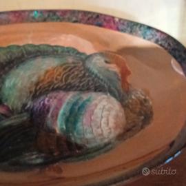 Bellissimo piatto vintage in vetro, con tacchino dipinto a mano, la decorazione è stata fatta sul retro del dipinto. Il piatto è degli anni 60.