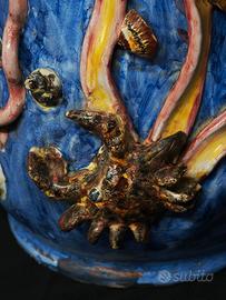 Il Portaombrelli presenta una ricca decorazione a rilievo a tema marino con numerosi elementi modellati e applicati a mano: pesci, coralli, conchiglie, cavalluccio marino e polpo emergono dalla superficie creando un effetto tridimensionale che richiama il fondale marino.