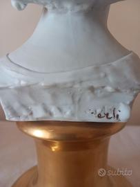 Grande Scultura Busto Bambina Capodimonte - Firmata Bruno Merli - h 30 cm Descrizione: In vendita imponente e raffinata scultura d'epoca raffigurante un busto di fanciulla con cerchietto, opera del celebre maestro Bruno Merli. Dimensioni Importanti: Altezza 30 cm, Diametro base 13 cm. Autore: Bruno Merli (firma incisa sul retro del busto). Marchio di Fabbrica: "N" coronata in blu sotto la base (Manifattura Capodimonte). Materiale: Porcellana Biscuit bianca (opaca, effetto marmo) su elegante base in porcellana dorata. Stato di conservazione: Eccellente. L'opera è integra, senza sbeccature, crepe o segni di restauro. La doratura della base è perfettamente conservata. Un pezzo da collezione di grande impatto visivo, ideale per arricchire interni classici o come prestigioso elemento di arredo. Per qualsiasi informazione contattatemi. ⚠️. Attenzione il busto della bambina è in ottime condizioni ,preferisco che venga ritirato a MANO.
