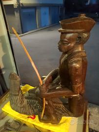 Grande scultura complessa indigena originale in legno massello molto pesante. vi è scolpito un pescatore che seduto sta pescando con canna e un pesce attaccato alla lenza tutto autentico e in perfette condizioni.