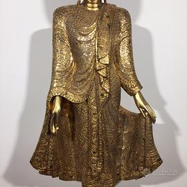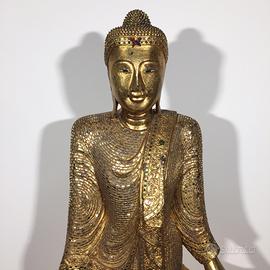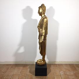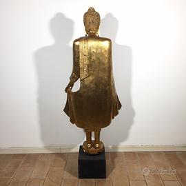 Grande statua in legno rivestita in oro del Buddha viaggiatore