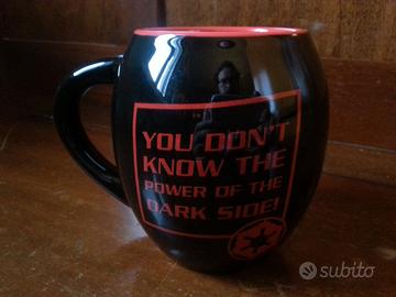 Vendo grande tazza / mug originale, in ceramica smaltata, con manico, prodotta su licenza " 2014 Lucasfilm Ltd. & TM" , raffigurante Darth Vader su di un fronte e recante sull'altro la citazione : "YOU DON'T KNOW THE POWER OF THE DARK SIDE!" ; non ha segni di utilizzo, in ottime condizioni di conservazione .