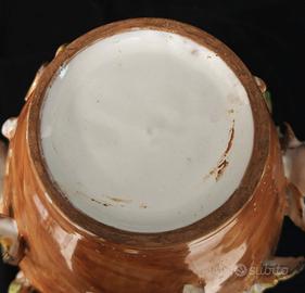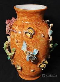 Vaso decorativo in ceramica artistica vietrese caratterizzato da una ricca decorazione marina applicata a rilievo.