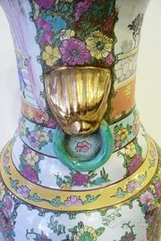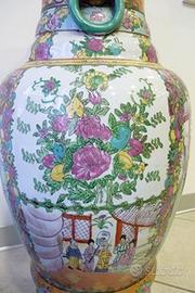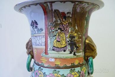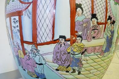Grande e pregevole vaso Cinese da ornamento in ceramica dipinta a mano con motivi rappresentativi di scene domestiche e contorniate da inserti floreali.