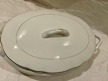 Grande Zuppiera S.C. Richard divenuta poi RICHARD GINORI. Porcellana Bianca Con Decoro Filo Oro Zecchino. Perfetta!! Di forma ovale, presenta le seguenti dimensioni: altezza massima cm 16,5 circa, larghezza massima cm 24,0 circa e lunghezza totale con manici cm 42,0 circa.
