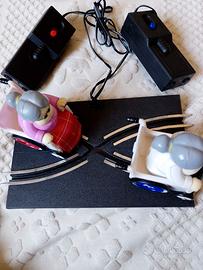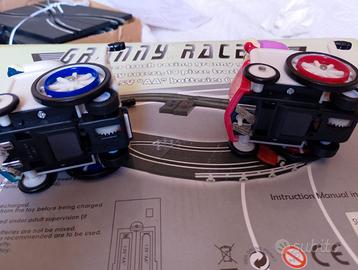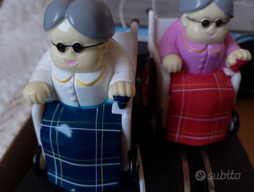 Vendo questa rara pista a batterie, mai usata, solo testata e perfettamente funzionante. Molto particolare in quanto al posto delle auto ci sono due anziane in carrozzella. Da collezione.