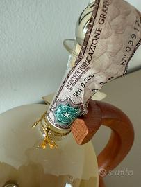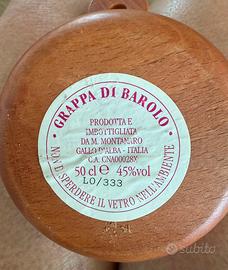 Grappa di Barolo, particolare bottiglia con supporto in legno.