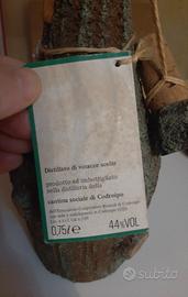 La grappa è contenuta in un’elegante bottiglia in corteccia di legno, con ceralacca originale e cartellino descrittivo dell’epoca, che riporta: