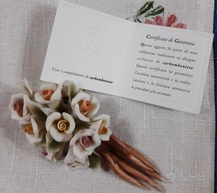 Due oggetti vintage da collezione, se presi assieme euro 53,00 - per collezionisti degli oggetti in cristallo swarovski, bellissimo grappolo d'uva con farfalla in cristallo posata all'inizio del tralcio di vite che ha due foglie, una con brillantini argentati e una semplice, e continua con una spirale in vetro. il grappolo ha 12 chicchi in vetro satinato. sempre stato in vetrina, perfetto. lavorazione a mano e componenti in cristallo swarovski come da sua garanzia. cm10 + cm1 del corpo farfalla x larghezza cm6 circa. completa il tutto la sua scatola di cm13xcm9,5x h.cm6 euro 40,00 - fine bouquet di roselline, in stile capodimonte, in porcellana, con sfumature delicate che vanno dal bianco crema a pesca, ocra e rosa antico. creazione che fa parte di una collezione realizzata su disegno esclusivo di CARBOMBONIERE ( FIRENZE), come da suo certificato che ne garantisce la sua autenticita'. perfetta nella sua scatola di cm10,5xcm7,5xh. cm5, sempre tenuta in cassetto, bomboniera del 2012. cm11xcm5 euro 18,00 preferibile ritiro a mano, eventuale spedizione con corriere.