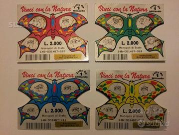 Vendo serie completa Gratta Vinci "Vinci con la natura" composta da 4 biglietti con farfalla grande sagomata rossa, verde, blu e gialla.
