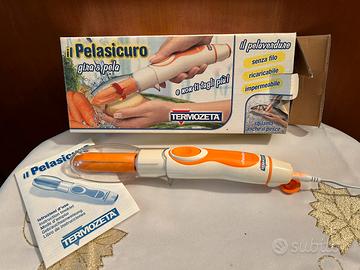 2)Pelasicuro,Termozeta, senza filo, ricaricabile e impermeabile,per togliere la buccia alla frutta e alla verdura e squamare il pesce. Funzionante, usato pochissimo e ancora nella sua confezione originale.