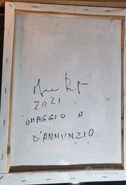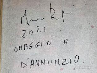 Graziano Rey è artista molto poliedrico, attivo non solo nella pittura ma anche nella musica e nella sceneggiatura. Il suo stile si distingue per l'uso di collage, texture materiche e l'inserimento di parole o frammenti di testo come il "Plim" che si nota sullo sfondo, creando opere che fondono l'astratto con l'iconografia Pop. l fatto che il soggetto sul fronte sia la stilista Zhu Chongyun (Krizia) in un'opera intitolata "Omaggio a D'Annunzio" suggerisce una riflessione dell'artista sul legame tra moda, stile e italianità, temi molto cari al "Vate" Gabriele D'Annunzio. La parola "Plim" che viene ripetuta sul fronte è un elemento tipico di Graziano Rey. L'artista, che ha un background anche musicale, utilizza queste sillabe brevi e onomatopeiche come se fossero "note visive" o battiti ritmici per dare musicalità alla tela. Il ritaglio "arma a doppio taglio" e la fusione tra icone della moda e icone pop suggeriscono una riflessione critica e poetica sulla bellezza e sul potere dell'immagine nella società contemporanea. Collage e tecnica mista su tela. Dimensioni: 30x40