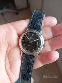 Le misure sono da uomo 34 mm esclusa la corona e 43 mm alle anse. La meccanica è un 17 Rubini, tutto marcato a carica manuale, funziona perfettamente, tiene bene il tempo. Il quadrante nero perfetto (bellissimo) come nuovo con indici argentati, Il vetro in polimeri senza graffi, la corona non ha il logo, il fondello in acciaio tutto marcato ed in ottime condizioni.
