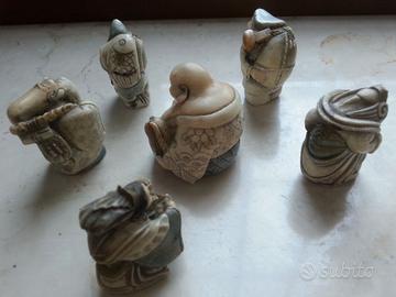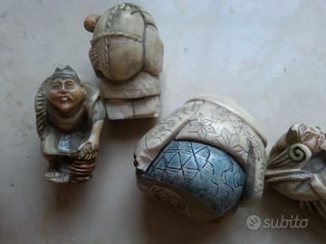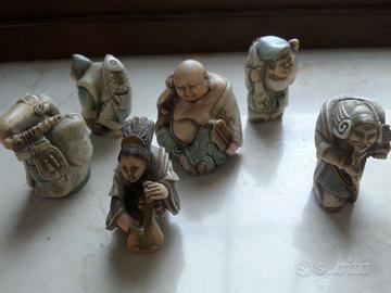 Vendo gruppo di 6 netsuke in resina dipinti a mano, (marca NIGRI), raffiguranti personaggi tipici della cultura giapponese , molto partivolareggiati e curati nei dettagli ;