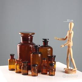 Gruppo di 10 vasi da farmacia in vetro ambrato, di diverse dimensioni.