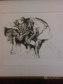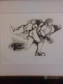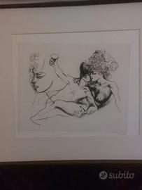 Renato Guttuso - "Neronis Vita: Atte e Nerone" (1974) Raccolta completa di 7 acqueforti originali Descrizione dell'opera : Prestigiosa cartella completa contenente sette acqueforti originali del maestro Renato Guttuso, realizzate nel 1974 per la serie "Neronis Vita: Atte e Nerone". L'opera esplora con la caratteristica forza espressiva di Guttuso il tema dell'amore tra l'imperatore Nerone e la liberta Atte, attraverso immagini di forte impatto visivo ed erotico. Caratteristiche tecniche : Tecnica: Acqueforti originali (5 in bianco e nero, 2 colorate) , Dimensioni lastra: 39,5 × 57 cm , Dimensioni foglio: 64 × 85 cm , Firma: Autografa a matita al fronte. Numerazione: Esemplare X/XL (edizione in numeri romani) ; Contenitore: Elegante scatola in legno di 70 × 90 × 6 cm Dati editoriali: Stampatore: Fetthaver Loending, Amburgo Editori: Graphis Arte (Livorno) e Pantheon Presse (Agno) ; Tiratura: Edizione limitata di 80 copie numerate in arabi, 40 copie in numeri romani (I/XL-XL/XL) e 10 prove d'artista. Stato di conservazione : Opera in ottimo stato conservativo, venduta senza cornice. ; Note Raccolta di grande pregio per collezioni d'arte moderna e contemporanea. Il ciclo presenta contenuti per adulti di natura erotica esplicita. La vendita è motivata da esigenze di ricollocazione della collezione privata. Valuto permuta con dipinti a olio su tela dell'Ottocento di scuola napoletana .Per informazioni, foto dettagliate e possibilità di visione, contattatemi privatamente.