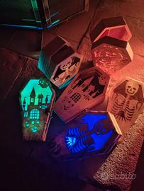 Halloween Horror Wood Coffin Handmade Gadget Colourful With Light Funny Toys. Handmade wood coffins, with colorful changes light, like in photos, objects of the photos. 20 cm tall about. Scary, funny gadgets for Halloween, Party or collections. Battery included.
