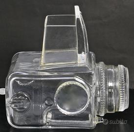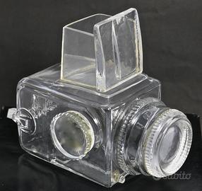 Raro modello commemorativo originale svedese prodotta in fine cristallo riproducente la fotocamera Hasselblad 500C/M in dimensioni 1:1 e con incisione a mano del designer Christer Sjogren della vetreria svedese Lindshammar. Modello serie n. 95 prodotto nel 1979 in pochi esemplari come oggetto promozionale per un ristretto numero di rivenditori specialisti Hasselblad per tutto il mondo. La fotocamera è un assemblato di quattro fusioni: corpo macchina, obiettivo, avvolgitore laterale e mirino a pozzetto. Il modello è integro senza rotture e/o rigature ed è imballato nella sua scatola originale anche lei in ottime condizioni. Ultimamente un modello analogo è stato battuto all'asta WestLicht Photographica Auction di Vienna per Euro 840,00.