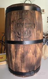 Questa botte è stata ideata da uno dei più famosi designer italiani e realizzata a mano con legno curvato a vapore. Il legno è stato invecchiato con trattamenti artigianali, trattato con una patina di cera per preservarlo nel Tempo. Il marchio è stato impresso a fuoco . Botte numero 65 di 100. Misure 57 x 33 cm . La bottiglia è da 3 litri ed è vuota, solo espositiva.