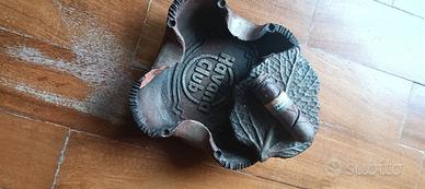 Presenta un design rustico che imita una foglia e incorpora un sigaro scolpito come poggia-sigaro.