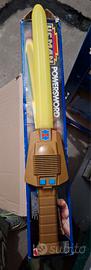 La spada è stata tolta dalla sua scatolo solamente per verificare se all'interno della spada c'erano le 4 batterie dagli anni 80 in modo da essere certi che non avessero compromesso lutilizzo dall'oggetto. All'interno non c'era nulla quindi il vano batteria è nuovo e la spada è perfettamente funzionante. Scatola aperta con le dovute maniere