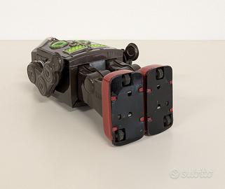 Da fermo, si aprono le porte sul torace che estraggono una mitragliatrice a doppia canna che aziona il fuoco, lampeggiando con suoni