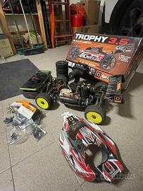 Modello radiocomandato ad elevate prestazioni. Grazie al robusto motore 3.5cc é perfetto anche per i principianti! – potente ed affidabile – 70km/h – con radiocomando a 2.4Ghz – 4×4 Il modello rispetto alla versione di serie monta gomme da pista ed alcuni particolari plastici sono stati sostituiti con quelli in ergal. Insieme vendo: - Set aggiuntivo di gomme da terra; - Avviatore elettrico a batteria; - Diversi ricambi (mozzi, braccetti, filtri aria, ecc....); Vendo per inutilizzo.