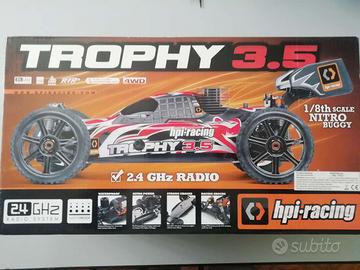 Vendo splendido HPI TROPHY buggy nitro in scala 1:8 con motore da 3,5cc, nuovo.! Questo kit ha tutto ciò di cui hai bisogno per qualsiasi cosa tu voglia fare. Ha un telaio in alluminio resistente, come le torri degli ammortizzatori, per le migliori prestazioni in pista. E’ dotato di un potente motore Nitro Star F3.5 (.21 pollici cubi), pneumatici da corsa HB Proto design, ammortizzatori a bagno d'olio, tenditori a vite e numerose possibilità di regolazione della messa a punto. Oltre ad essere nato per le gare e pronto per l'azione in pista, il Trophy 3.5 ha anche un bell'aspetto. L'elegante scocca da corsa aerodinamica presenta un nuovissimo design della vernice e gli pneumatici HB Proto sono avvolti attorno a fantastici cerchi cromati neri a 7 razze. L'ala posteriore non è solo per l'estetica, ma dà al Trophy un carico aerodinamico e controllo nell'aria.
