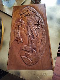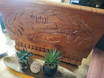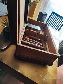 Stupendo humidor intarsiato completamente a mano. Interni in legno di cedro profumato. Regalo i sigari e gli accessori come da foto. Eventualmente riverniciato all'esterno a seconda dei gusti ma così grezzo ha il suo giusto mood e anima artigianale. Misure 50x28 cm - h. 16 cm.