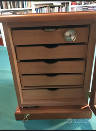 PREGIATA e ESCLUSIVA sala da fumo HUMIDOR per sigari in legno. Progettato per conservare i sigari, l'interno è rivestito in legno di cedro spagnolo che aiuta a mantenere un clima costante e a proteggere dai parassiti del tabacco. Include un igrometro integrato per monitorare il livello di umidità e un umidificatore per preservare l'aroma e la freschezza dei sigari. I cassetti sono dotati di scanalature di ventilazione per garantire una circolazione ottimale dell'aria all'interno. CONDIZIONI: nuovo da vagliare quale IDEAREGALO per appassionati.