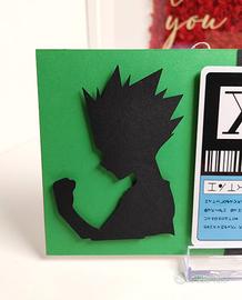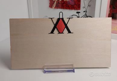 Targa in legno decorata a tema Hunter X Hunter, può essere esposta appoggiandola su uno stand, oppure appesa al muro con il gancetto.