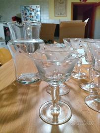 set completo calici e caraffa della nonna Art decò calici per ogni gusto acqua spumante vino liquore e rosolio abbinata caraffa d' epoca i calici sono di timo vetro trasparente con una percentuale di piombo per una maggiore lucentezza con motivi lineari 20 calici + caraffa mai usato