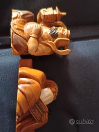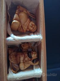 Elegante cofanetto in legno contenente sette piccole sculture, in materiale pregiato, finemente intagliate, rappresentano i sette saggi, figure emblematiche della cultura orientale. Ogni scultura è stata realizzata con grande cura dei dettagli, dai tratti del volto agli abiti tradizionali, e conserva un' espressività unica. Un pezzo raro che aggiungerà un tocco di cultura e raffinatezza alla tua collezione. Non sono netsuke, ma piccole sculture.