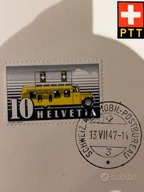 Francobollo: Il francobollo raffigurato da 10 centesimi (Helvetia) mostra un autobus postale PTT giallo, simbolo dei trasporti svizzeri.
