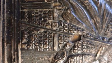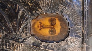 Antica icona dipinta , rivestita con. lamina riza argento su tavola cm 27x18