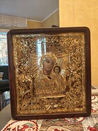 Icona antica 44x40x9 molto bella e particolare sia nel dipinto su tavola sia come lavorazione sulla lamina dorata , legno da trattare eventualmente lamine da consolidare al telaio.