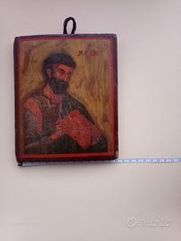 Splendida icona religiosa raffigurante San Marco Evangelista, realizzata con tecniche iconografiche tradizionali su solida tavola di legno. Il Santo è rappresentato nel classico atto di reggere il Vangelo, con uno sguardo assorto e solenne.